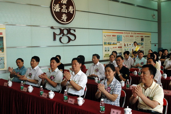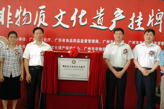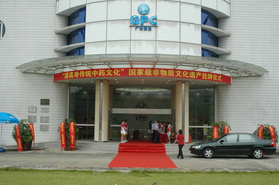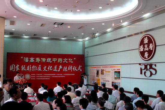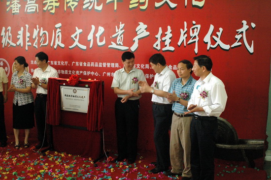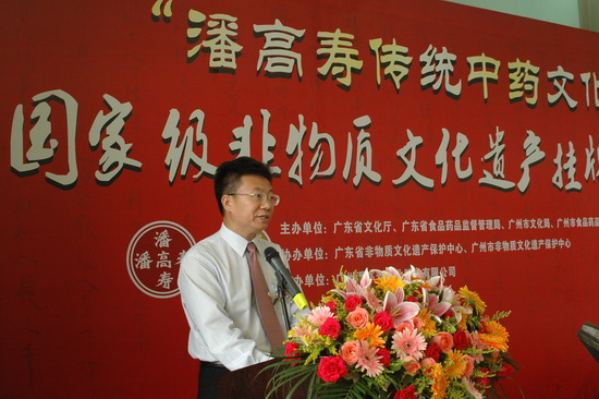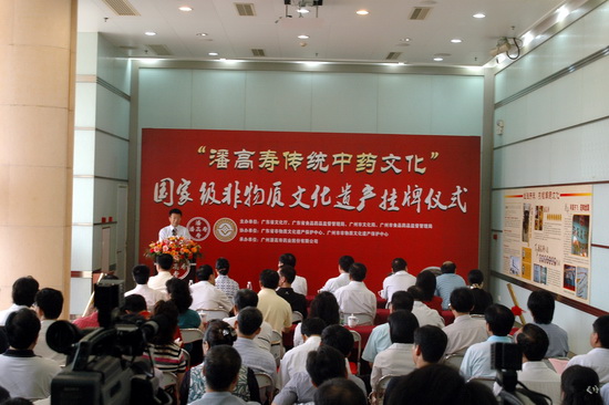 610由廣東省文化廳、廣東省食品藥品監督管理局、廣州市文化局、廣州市食品藥品監督管理局等單位聯合舉辦“潘高壽傳統中藥文化” 國家級非物質文化遺產掛牌儀式在我司隆重舉行。廣州市政協副主席平欣光、廣東省文化廳副廳長杜佐祥、廣東省食品藥品監督管理局副局長馬光喻、廣州市文化局局長陶誠、番禺區副區長黎偉棠,以及廣藥集團黨委書記林繼紅、廣藥集團紀委書記、廣州藥業黨委書記楊秀薇光臨,同時,省、市非物質文化遺產保護中心、省市老字號協會、廣東中醫藥博物館、番禺區科技局、番禺區食品藥品監督管理局、番禺區經濟貿易局、番禺區旅游局、番禺區東環街、廣藥集團、中山大學等單位的領導和專家出席了儀式。高朋滿座,還有來自潘高壽娘家人——開平市人民政府黃婉慈副市長親自帶隊成員有開平市人民政府關瑞斌副秘長、辦公室主任、開平市人民政府地方志朱柏林辦公室主任、譚月圓主編一行。儀式由廣州市文化局副局長張潤華主持。